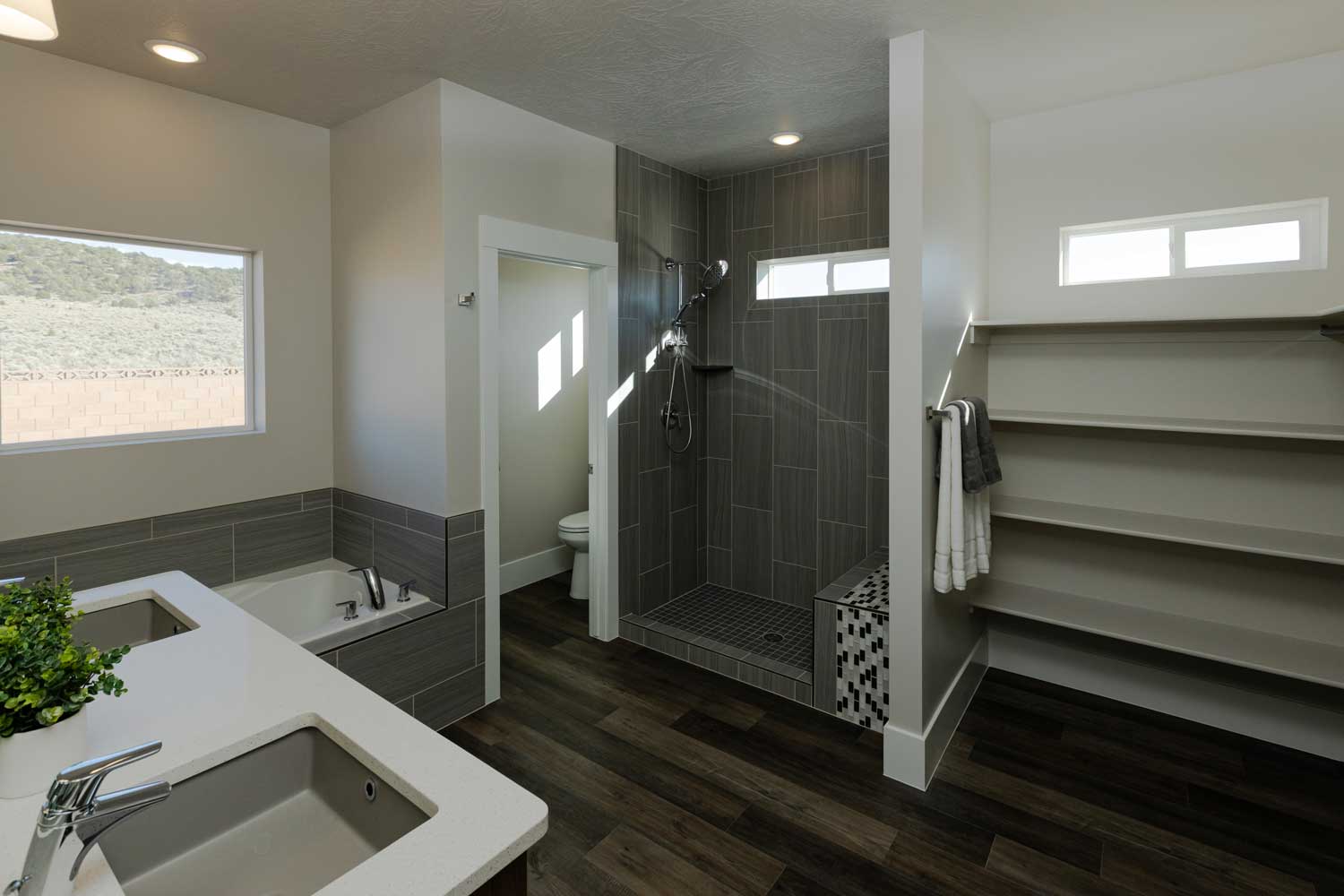 The contemporary style has lush wood-tones throughout, reminding you of the surrounding juniper forest. The elegant design harmoniously balances graceful curves and straight lines. Minutes from downtown and nestled into the treed hills, you’ll feel the peace of this refined home and brand new neighborhood. Note the stunning design of the master shower, and the innovate master bath layout that gives you so much space and light. Not only are the high standards of Choice Builders fulfilled in this home, it also has our signature energy efficiency with low cost heating and cooling and constant thermal comfort. Smartly designed space makes this moderately sized home feel large while aging-in-place principles make this home easy to live and get around in, regardless of physical limitations.